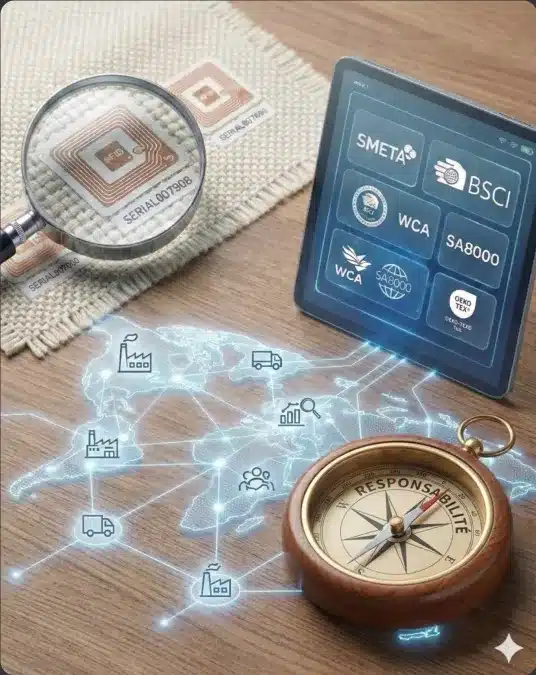 La responsabilité ne s’arrête pas à l’environnement. Nos fabricants et fournisseurs s’engagent aussi sur les conditions sociales tout au long de leur chaîne d’approvisionnement, avec des audits et labels garantissant le respect des droits humains, de la santé et sécurité au travail, et de l’éthique.