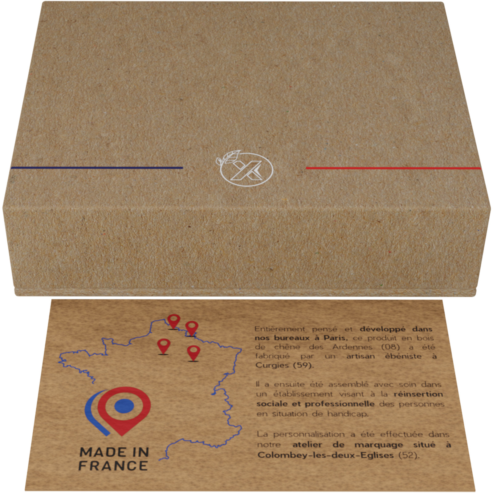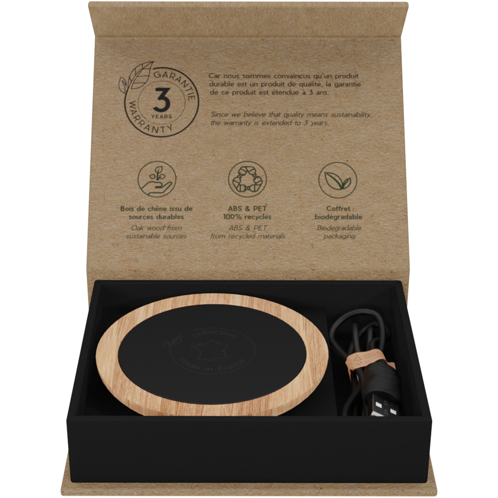 Kabelloses 10W Ladepad (8 x 0,8 cm), hergestellt in der EU aus französischem Eichenholz mit Soft-Touch Oberfläche. Diese Ladestation ist Qi-kompatibel und kann mit einem leuchtenden Logo individuell gestaltet werden. Wird in einer Geschenkbox aus Recyclingpapier mit Magnetverschluss geliefert.