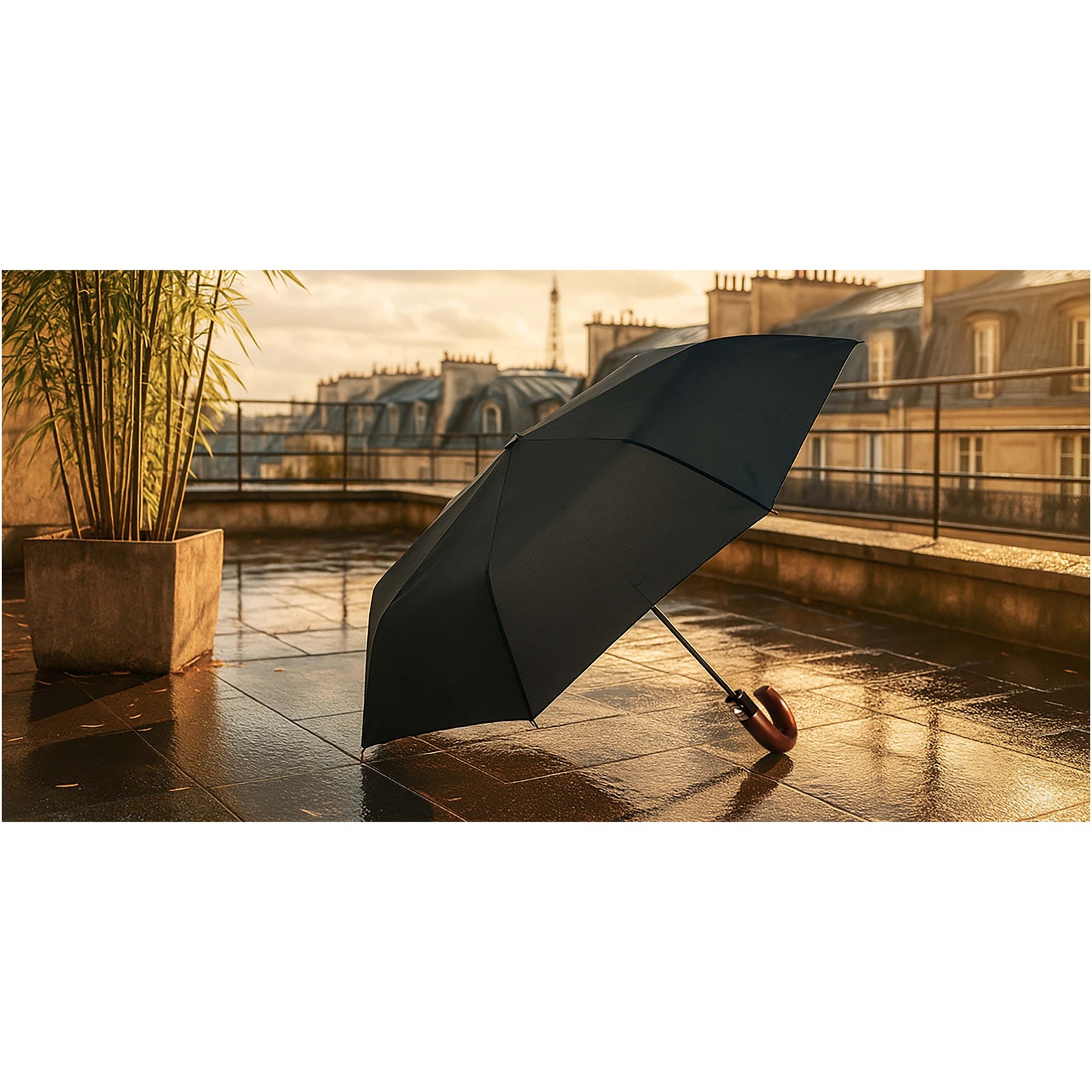 The Pepin foldable umbrella made from 100% recycled polyester is both practical and durable, featuring an automatic opening system for effortless use. Its fiberglass frame with metal shaft and reinforced tips ensures long-lasting strength, while the curved dark wood handle adds a refined, elegant touch. Supplied with a matching sleeve. Size: Ø95 × H63 cm. Made in Europe.