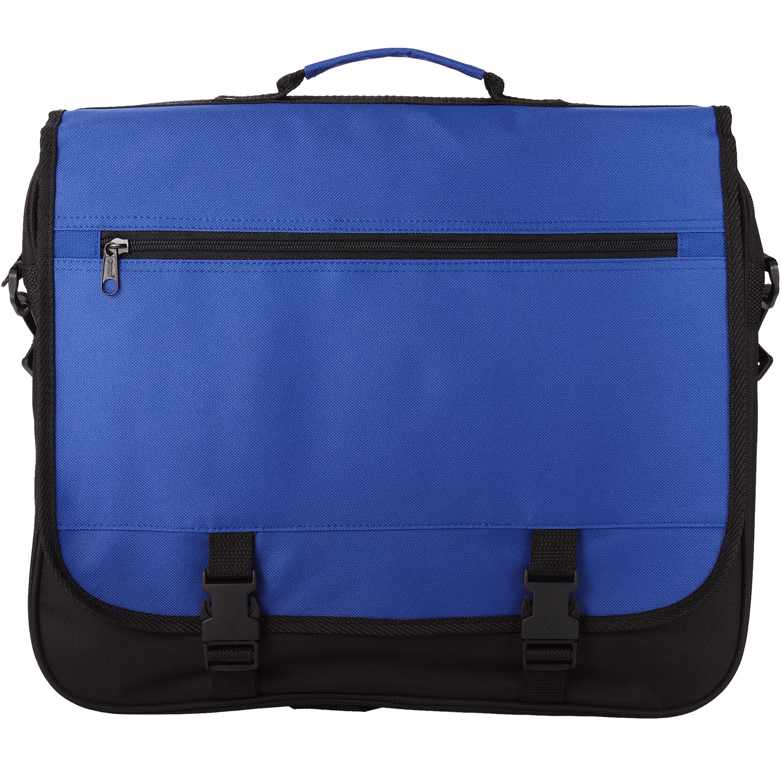 Sacoche conférence avec bandoulière ajustable, rabat à fermeture par boucle, poche zippée dans le rabat, compartiment principal zippé et plusieurs poches ouvertes sous le rabat.